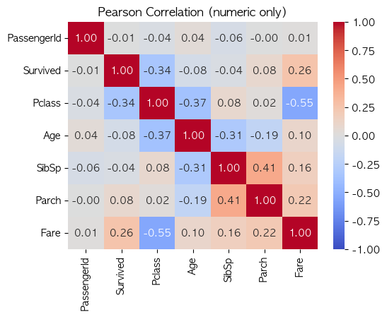 - 질문? titanic의 수치형 변수들끼리 관계(상관)를 한눈에 파악하려면 어떻게 해야하지?