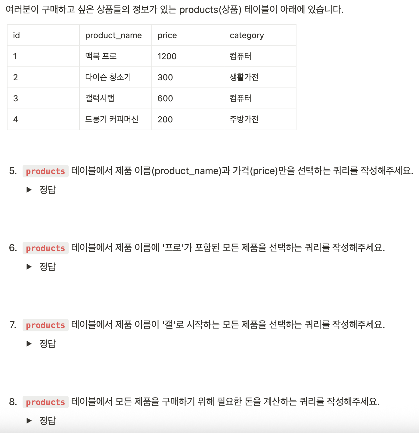 6번 문제에서 '프로'가 포함된 모든 제품을 선택하라는 질문이 있어서 in 문법을 사용하였음.(잘 못 불러옴)