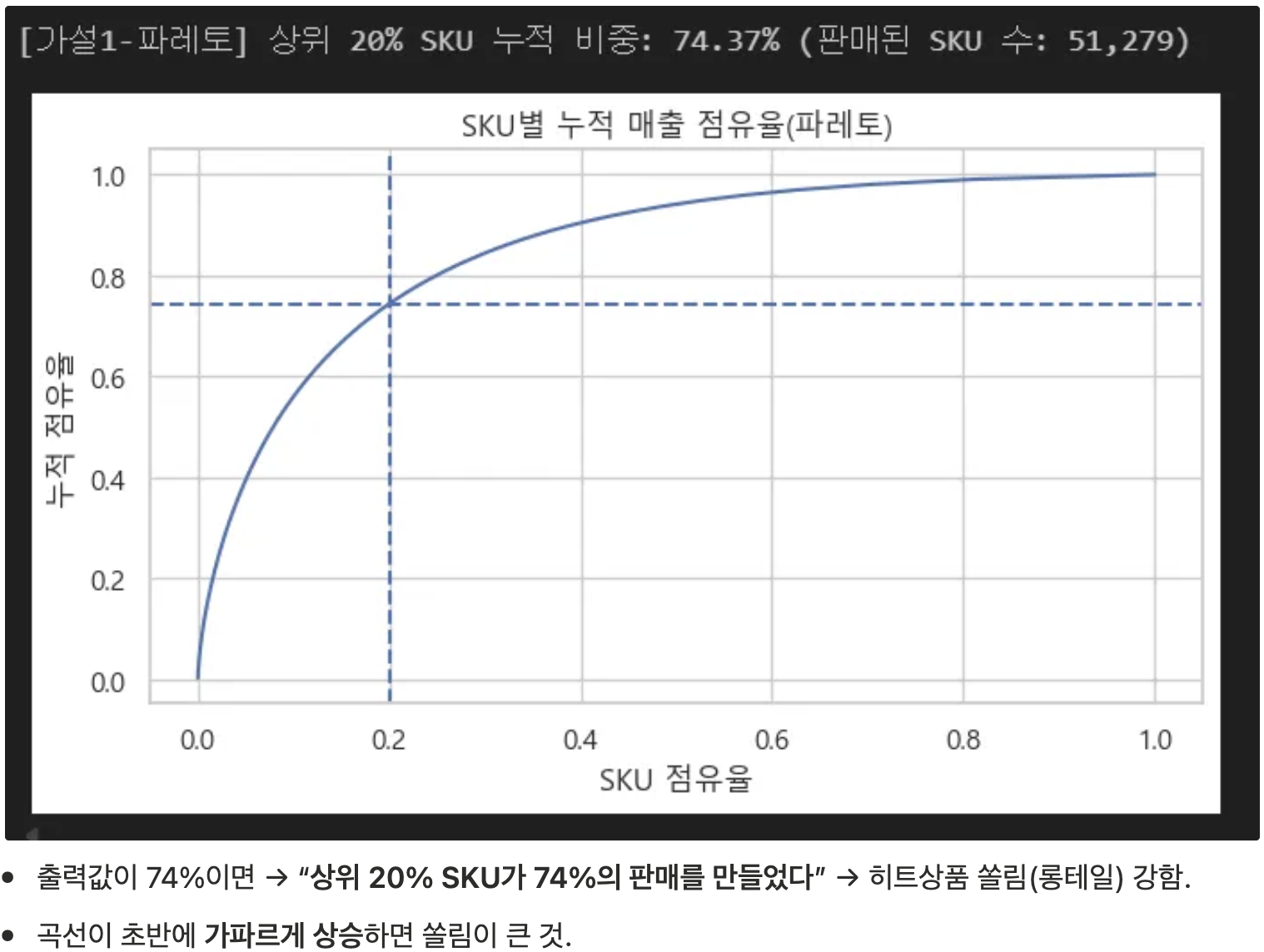 핵심 아이디어: SKU별 판매건수를 내림차순으로 누적합하여 상위 20% 지점의 누적 비율을 확인