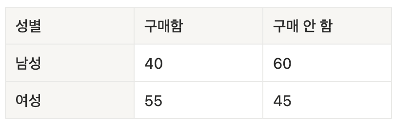- 귀무가설(H0) : "성별과 구매 여부는 서로 독립이다." (즉, 성별은 구매 여부에 영향을 주지 않는다)