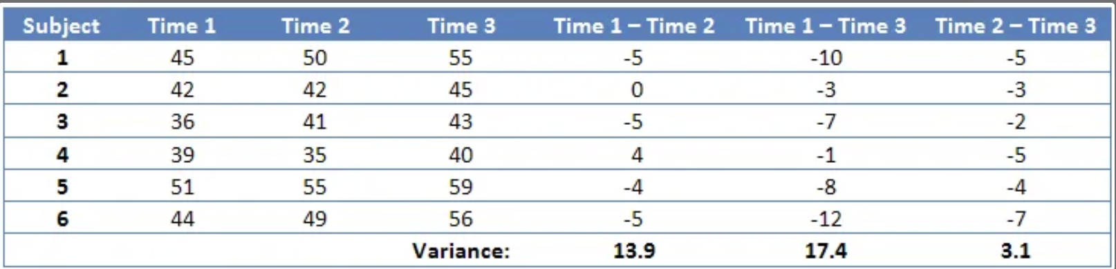 ✅ 즉, 모든 조건 간 차이의 분산이 같아야 한다.