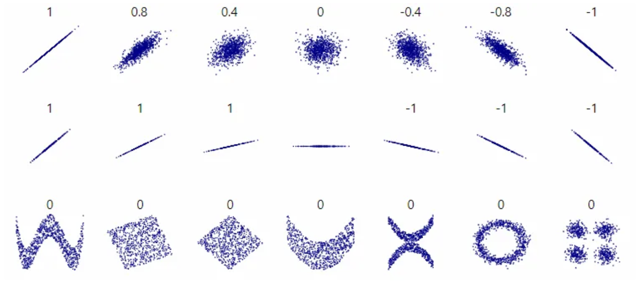 - -1에서 1사이 (1은 완전 양의 선형 / -1은 완전 음의 선형 / 0은 선형관계 없음)