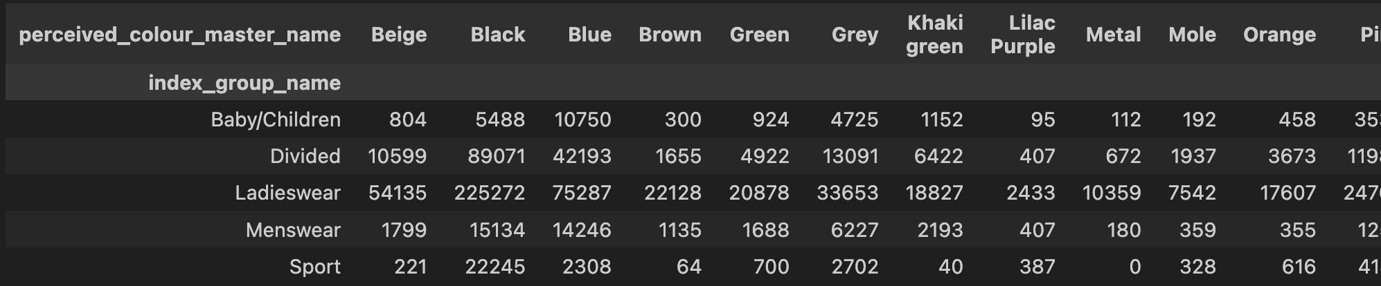 ct = pd.crosstab(df['index_group_name'],df['perceived_colour_master_name'])