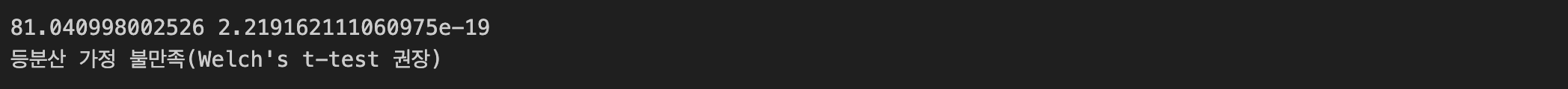 print("등분산 가정 불만족(Welch's t-test 권장)")