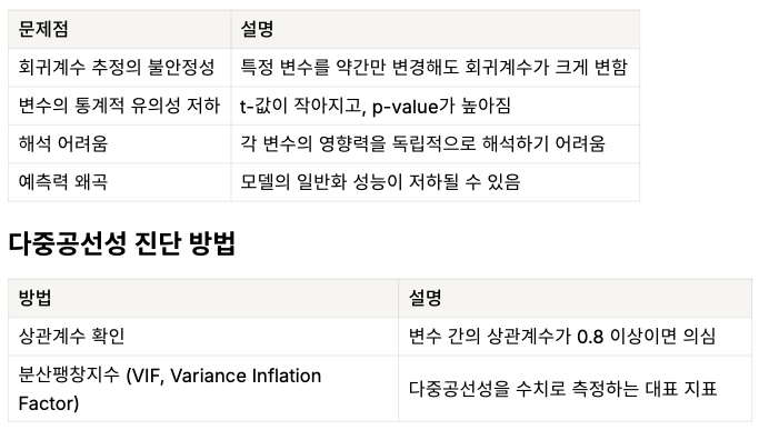 -> 독립변수들이 서로 비슷한 정보를 가지고 있어 회귀모형이 어떤 변수가 종속변수에 실제로 영향을 주는지 구분하기 어려워짐.