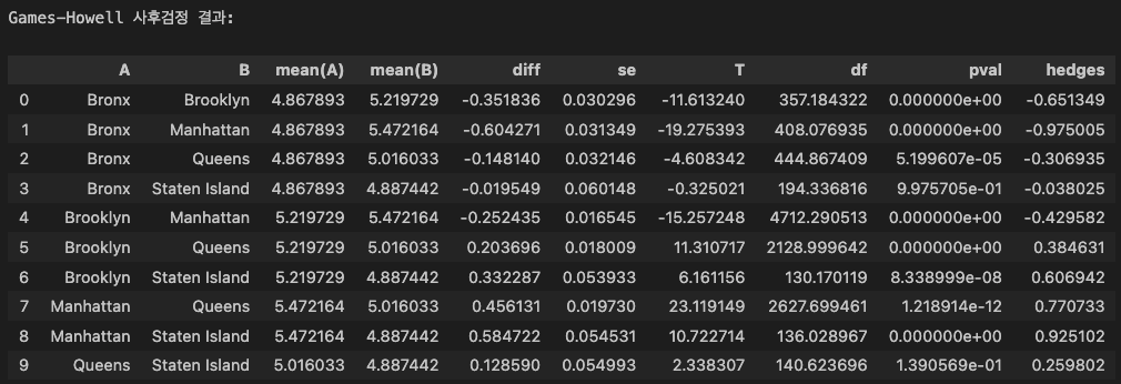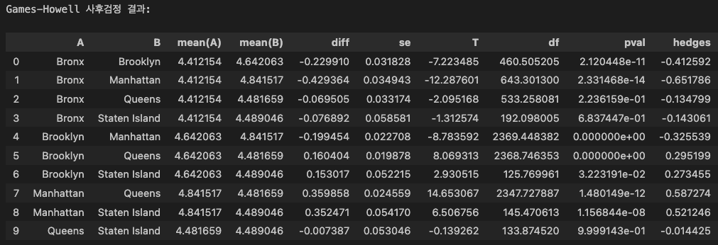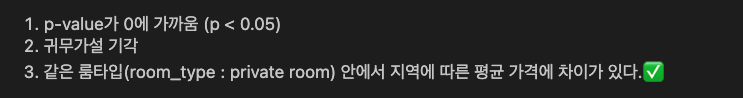- 사후검정 : games-howell Games-Howell 사후검정 결과 6-2. 같은 room_type(== 'Private room')일 경우에 지역별 숙소의 평균 가격 차이 검정 - 등분산성 검정(Levene's 검정) : 불만족 -> Welch ANOVA 사용 - 결과