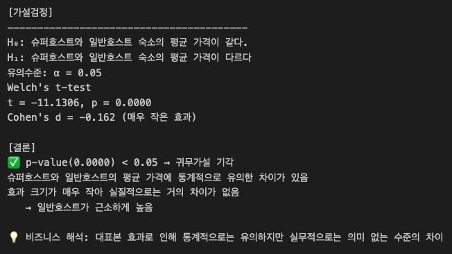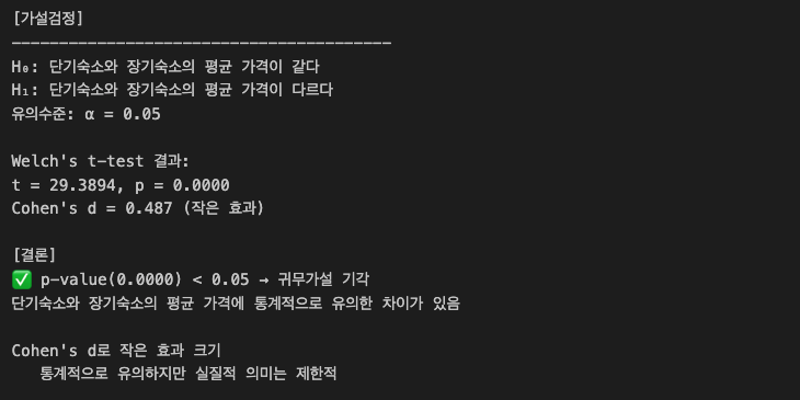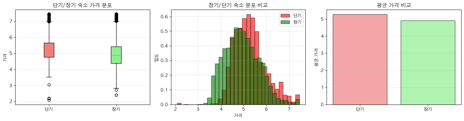 - 등분산성 검정(Levene's 검정) : 불만족 -> Welch t-test 사용 - 가설검정 : p < 0.05 (귀무가설 기각) - 즉시예약 가능여부에 따른 평균 가격에 통계적으로 유의한 차이가 있음 (즉시예약 가능의 가격이 훨씬 높음) - 비즈니스 해석 : 즉시예약 가능할 시 가격을 높게 책정할 수 있으며, 즉시예약 가능하도록 예약 조건 변경 권고 3. 단기/장기 숙박에 따른 평균 가격 차이 검정
