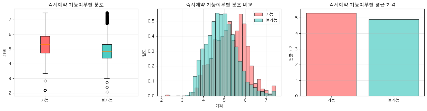 - 등분산성 검정(Levene's 검정) : 불만족 -> Welch t-test 사용 - 가설검정 : p < 0.05 (귀무가설 기각) - 슈퍼호스트 여부에 따른 평균 가격에 통계적으로 유의한 차이가 있음 (일반호스트가 근소하게 높음) - 비즈니스 해석 : 대표본 효과로 인해 통계적으로는 유의하지만 실무적으로는 의미 없는 수준의 차이 슈퍼호스트 여부에 따른 평균가격 차이 검정 결과 2. 즉시예약 가능여부에 따른 평균 가격 차이 검정 데이터 분포