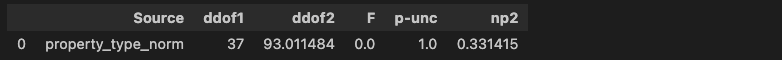 - 사후검정 : Games-Howell 7. 숙소 유형에 따라 평균 가격 차이 검정 : property_type_norm - 등분산성 검정 : p < 0.05, 불만족 -> Welch ANOVA - Welch ANOVA