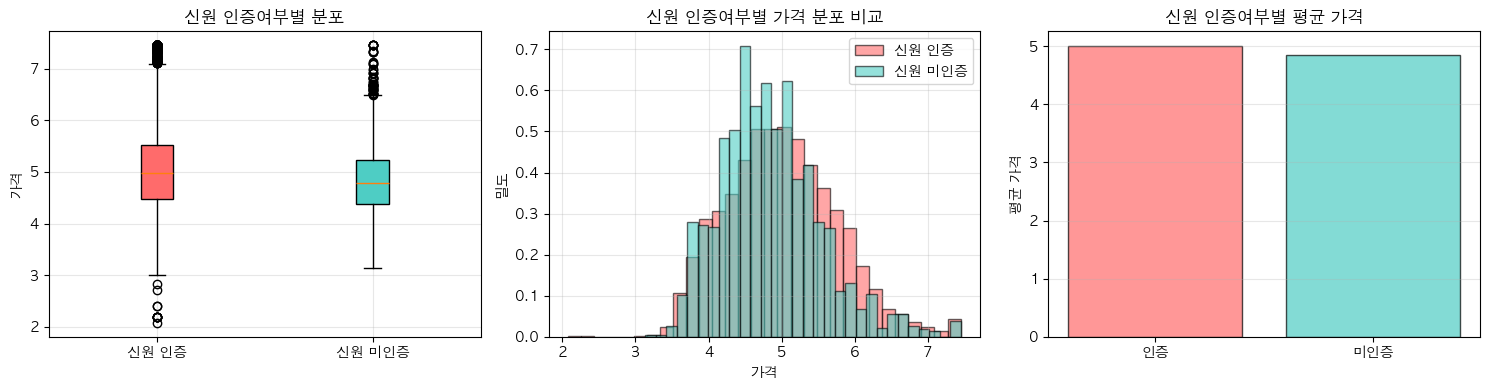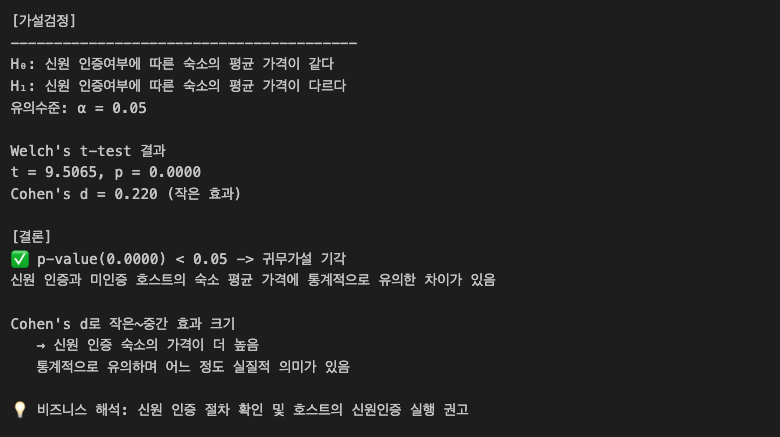 - 등분산성 검정(Levene's 검정) : 불만족 -> Welch t-test 사용 - 가설검정 : p < 0.05 (귀무가설 기각) - 단기숙소와 장기숙소의 평균 가격에 통계적으로 유의한 차이가 있음 - 통계적으로 유의하지만 실질적 의미는 제한적 4. 신원인증 여부에 따른 평균 가격 차이 검정