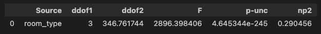 - 등분산성 검정(Levene's 검정) : 불만족 -> Welch t-test 사용 - 가설검정 : p < 0.05 (귀무가설 기각) - 신원 인증과 미인증 호스트의 숙소 평균 가격에 통계적으로 유의한 차이가 있음 - 신원 인증 숙소의 가격이 더 높음 (통계적으로 유의하며 어느 정도 실질적 의미가 있음) - 비즈니스 해석 : 신원 인증 절차 확인 및 호스트의 신원인증 실행 권고 5. 룸타입에 따라 숙소의 평균 가격 차이 검정 - 등분산성 검정 : p < 0.05, 불만족 -> Welch ANOVA - Welch ANOVA