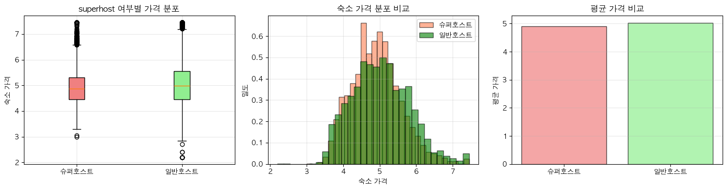 price의 히스토그램을 그려봤을 때, 오른쪽으로 긴 꼬리분포였음. 정규성을 맞춰주기 위해 로그변환 시도 -> 히스토그램 확인 결과 정규성 충족 t-test 1. 슈퍼호스트 여부에 따른 평균 가격 차이 검정 데이터 분포