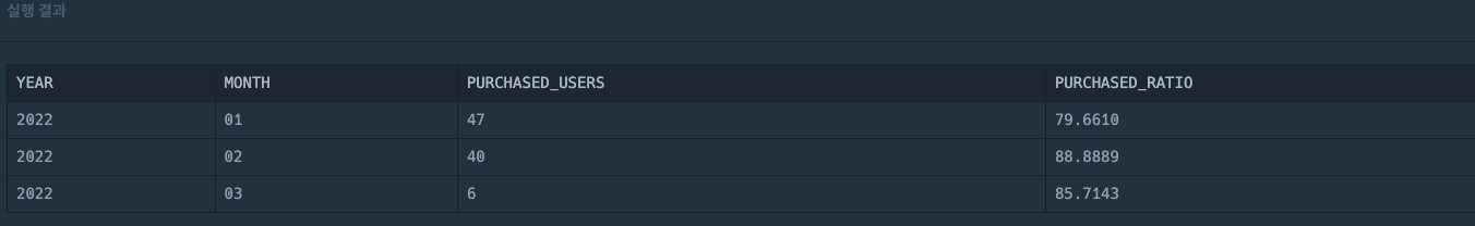 무언가 "상품을 구매한 회원 비율"을 구하는 것에서 문제가 생긴 듯 하다. 🚨 문제점 - 구매한 회원의 비율의 논리적 구조가 잘못되었음 - purchased_ratio(비율)에서는 정답예시와 같이 나와야 하므로, *100 을 하면 안됨.