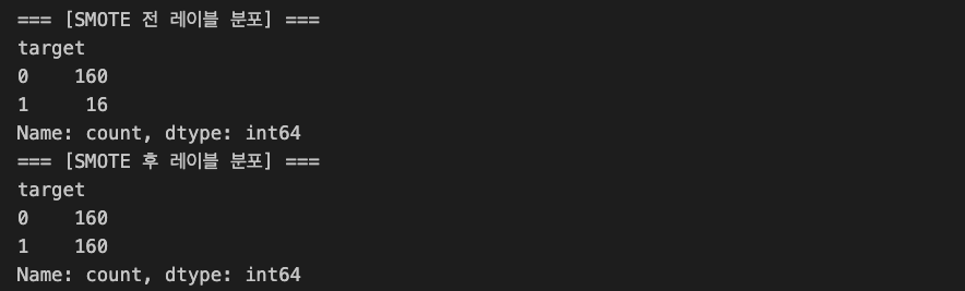 print("=== [SMOTE 후 레이블 분포] ===")