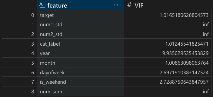 return pd.DataFrame(vif_data, columns=['feature','VIF'])