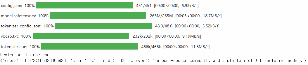 # {'score': 0.930..., 'start': 59, 'end': 122, 'answer': 'an open-source community and a platform of transformer models'}