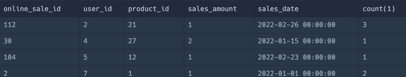 - user_id 가 2인 회원이 count(1)을 보면 3이라는 것은 상품을 3번 구매했다는 뜻.