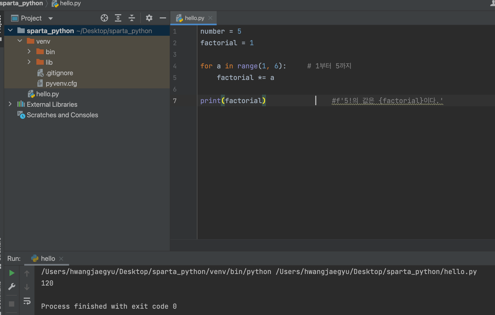 충분히 고민해 본 후, 구글링을 통해 팩토리얼 구하는 과정에서 range() 문법을 학습하고 재시도를 하여 위의 사진 같이 결과를 얻을 수 있었음.