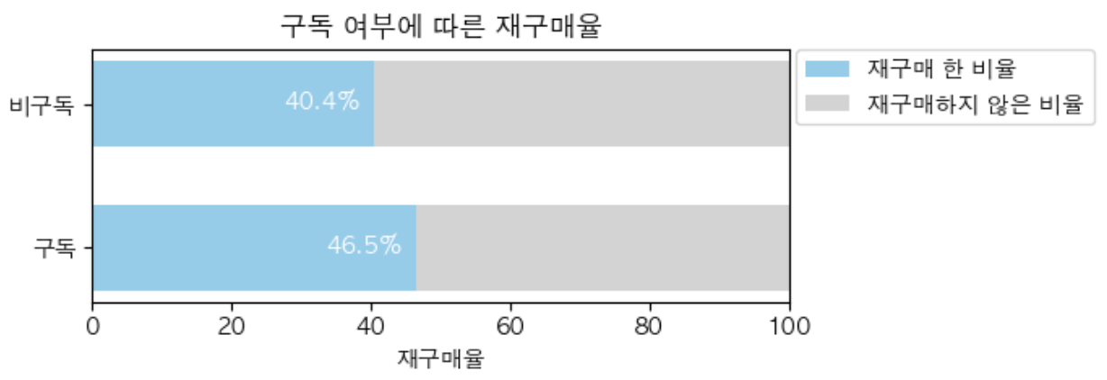 3️⃣ 발견 : 우리는 고객경험 개선이라는 목적 아래에 멤버쉽과 패션뉴스 구독여부를 집중하였다. (가설1)에 따라서 멤버십 형태에 따른 고객당 평균 구매액을 확인하였고, 그 결과는 생각과는 다르게 나왔다. 전체 고객 평균보다 활성과 신규 고객에서 낮게 나온 것!! 🚨 결과가 이렇다면 멤버십 형태가 매출에 영향은 거의 없겠다. (가설2) 패션 뉴스 구독여부에 따른 고객당 평균 구매액에서 차이가 발생한다는 사실을 발견하였다. 분명 구독자보다 비구독자의 수가 많고 매출합계 또한 많았지만, 이를 나누어 고객당 평균 구매액을 확인해보니 비구독자보다 구독자의 평균 구매액이 약 9%p 정도 높다는 점을 발견하게 되었다. 그래서 우리는 이를 더 보충하기 위해 패션뉴스 구독 여부에 따른 재구매율도 확인해보았다. 그 결과, 약 6%p 차이로 재구매율 역시나 구독자가 높다는 사실도 발견할 수 있었다! 올커니!!!!!! 그러면 결론은 이러하다. (인당 평균 구매액) × 구독자 수⬆️ = 총 매출⬆️ 이라는 공식이 성립할 것이다!! 구독자 수를 늘리자!!!!! [인당 평균 구매액을 ( ) 로 묶은 것은 평균값으로 고정이기 때문. 맞나?;;]
