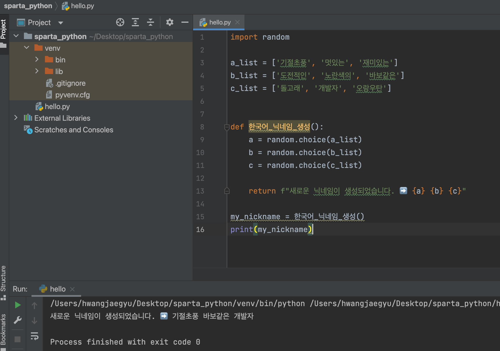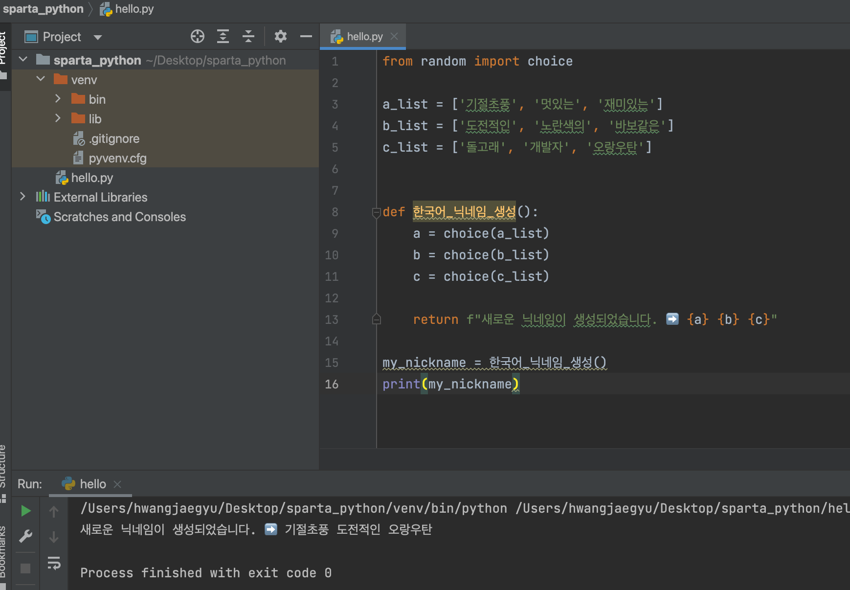 아직 처음이라 어떤 함수를 사용하여 풀어가야 하는지 아직은 낯설어 구글링에 의존하고 있지만, 자주 접해보며 익숙해지는 수 밖에 없을 듯 하다.오늘은 from, import, random, choice 와 def, return 을 활용하는 법을 랜덤한 닉네임 생성을 통해 배웠다.