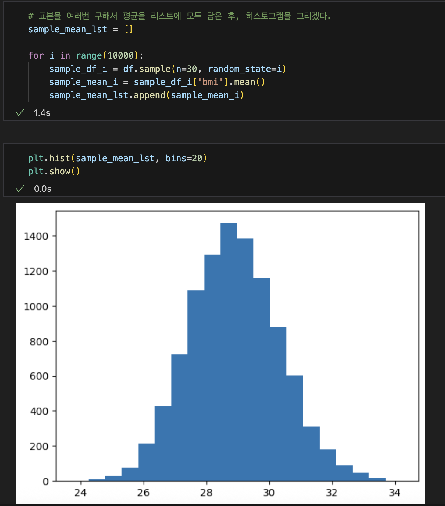 - 샘플 여러개를 구해서 표본평균의 히스토그램 그려보기