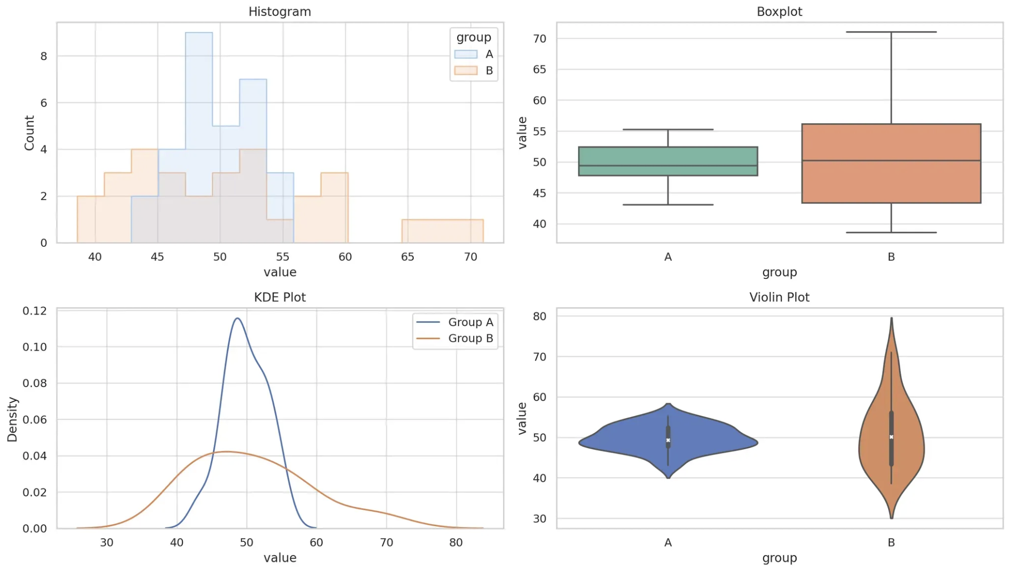 (없음 — 대신 기술적 비교는 가능) | 귀무가설H0H_0과 대립가설H1H_1 설정 → 검정통계량 → p-value로 판단 | “데이터가 우연에 의한 결과인가?” | t-분포/카이제곱 분포 등 시각화 |