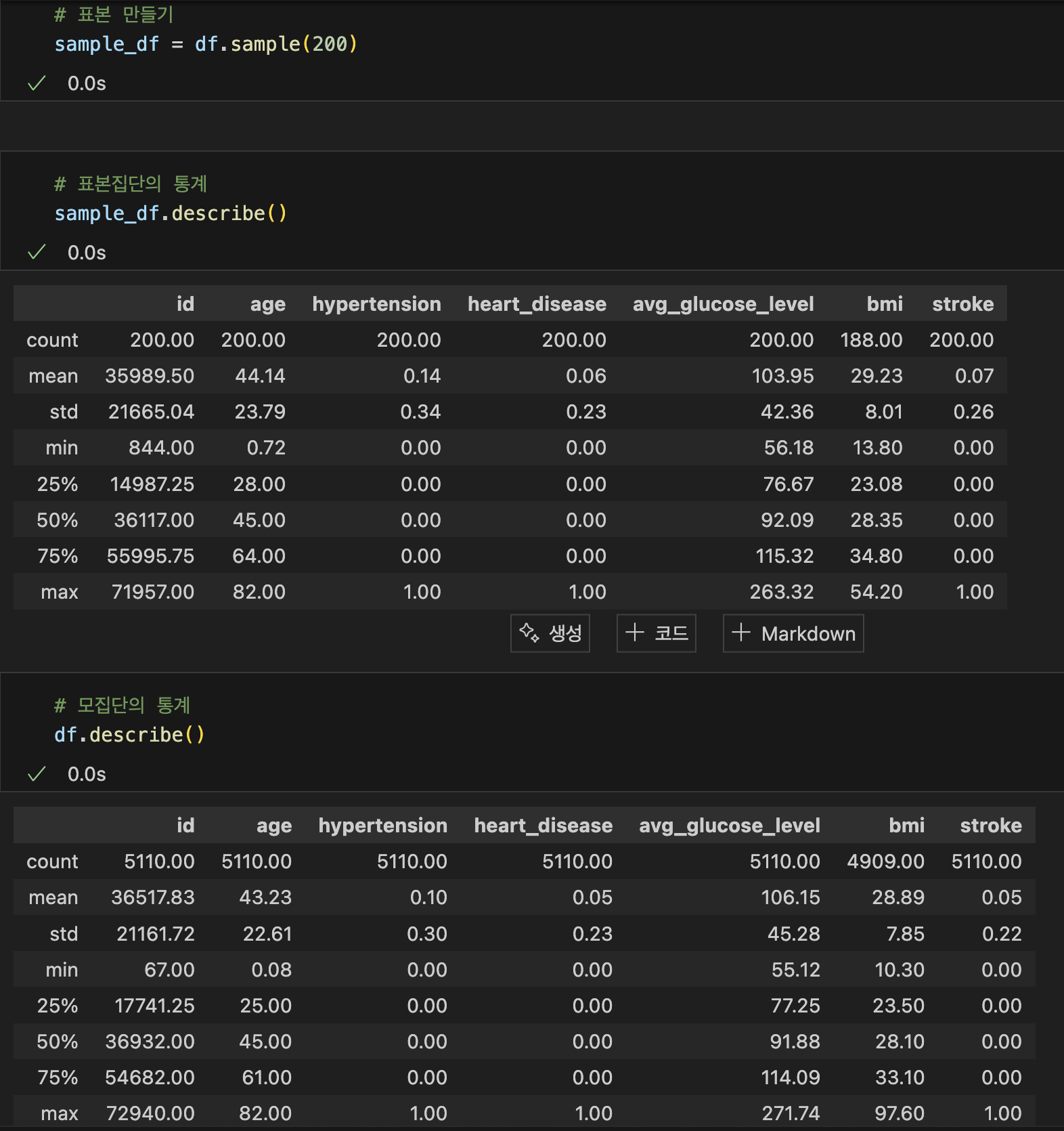 | 대상 | 주어진 데이터(표본 또는 전체). | 표본을 통해 모집단(parameter)을 추정하거나 가설 검증. | — | — |