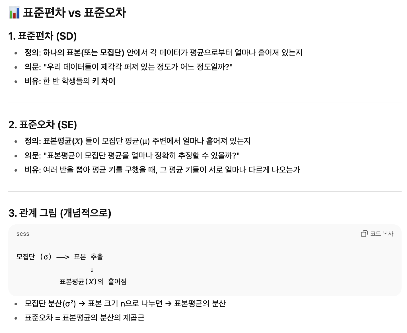 표준오차 SE=s/nSE = s/\sqrt{n}로 추정 불확실성 측정 | “측정값들이 얼마나 흩어져 있나?” | 박스플롯, 산점도 |