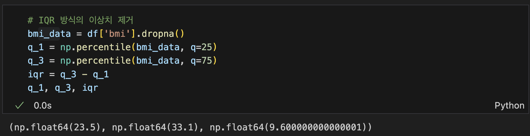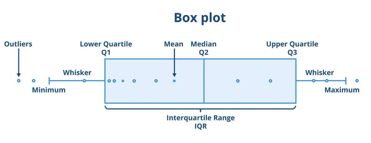 | 사분위수 (Quantile) | 데이터를 4등분: - 1사분위수(Q1, 25%) : 하위 25% 지점 값 - 2사분위수(Q2, 50%) : 중앙값(Mendian) - 3사분위수(Q3, 75%) : 상위 25% 지점 값 |