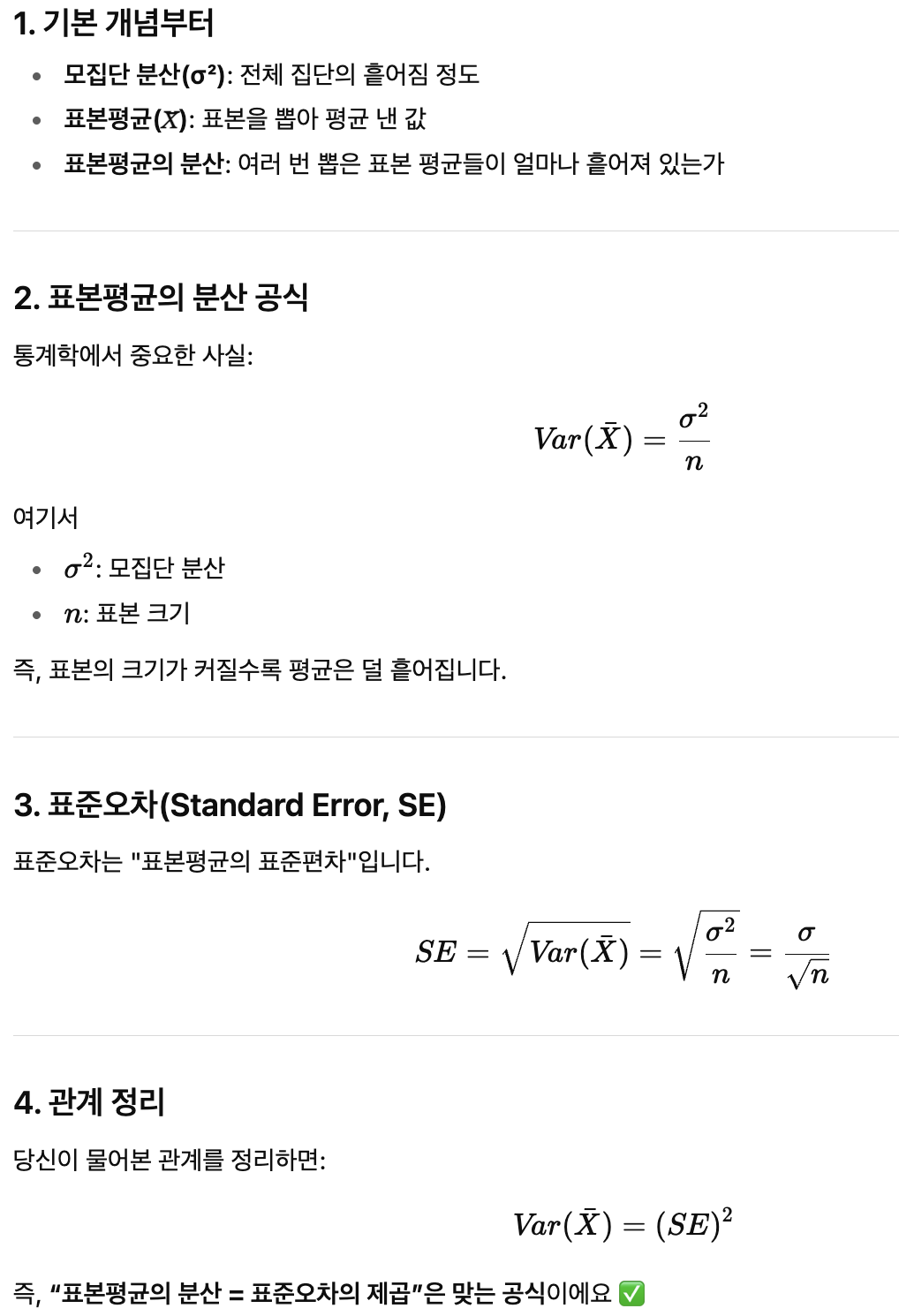 - 하지만 우리는 모집단의 분산($\sigma^2$)을 모르니까 우리가 아는 표본의 분산($s^2$)으로 대체한다 → $\frac{s^2}{n}$
