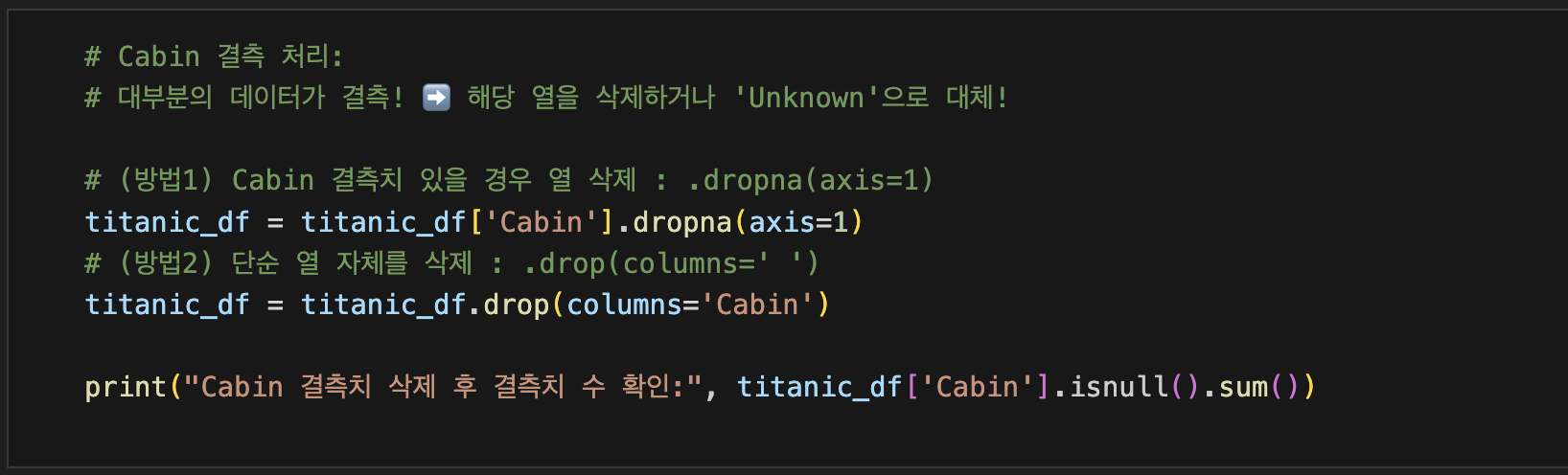 print("Name컬럼 제거 후:", cleaned_titanic.columns.tolist())