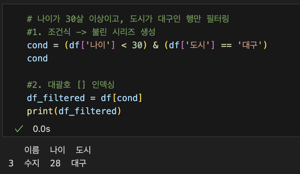 1. 조건식 : 나이 조건(df['나이'] >= 30)으로 불린 Series 생성