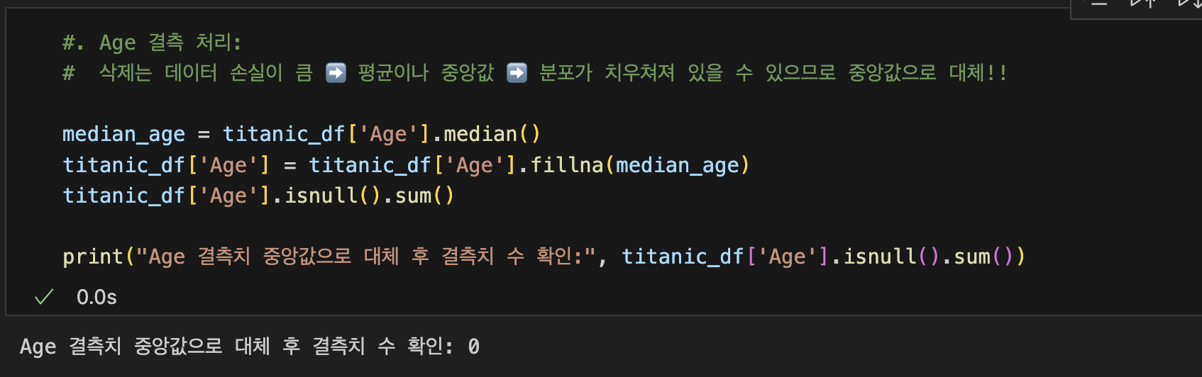 ➡️ 수치형 데이터 : df['Age'] = df['Age'].fillna(mean_age)